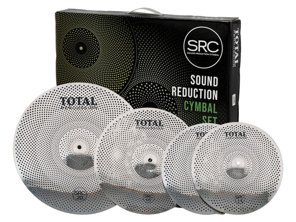 Sound Reduction Cymbals from Total Percussion allow you to play 24/7. Using a proprietary Stainless Steel alloy, these cymbals are specifically designed to reduce volume for 24/7 practice, but not enough to lose the tones and pitches of the different sized cymbals in your set. SRC cymbals offer a reduced sound playing level for smaller acoustic gigs that can also be mic'd through a PA.